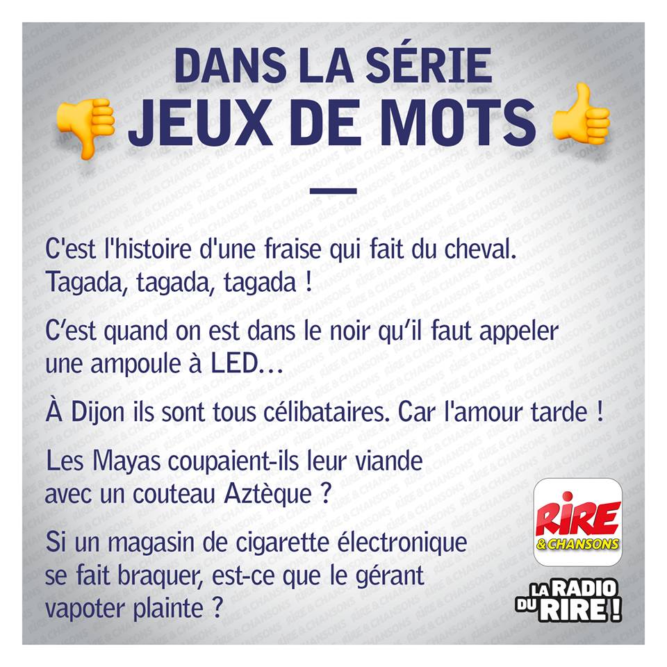 Rire et Chansons reprend également certaines des blagues les plus “likées ” sur le Facebook de la radio, que vous pouvez suivre ici : https://www.facebook.com/Rirechansons/
