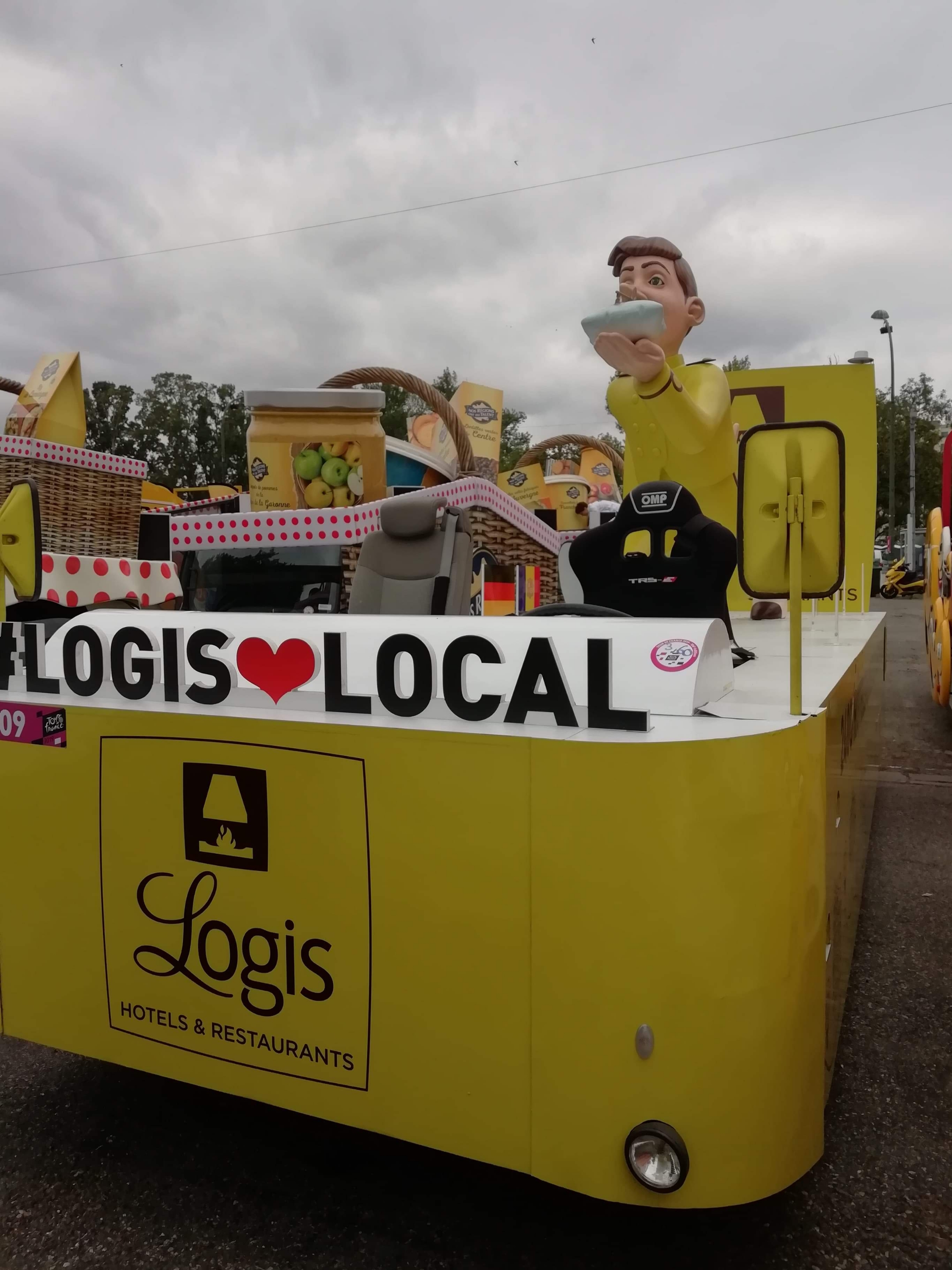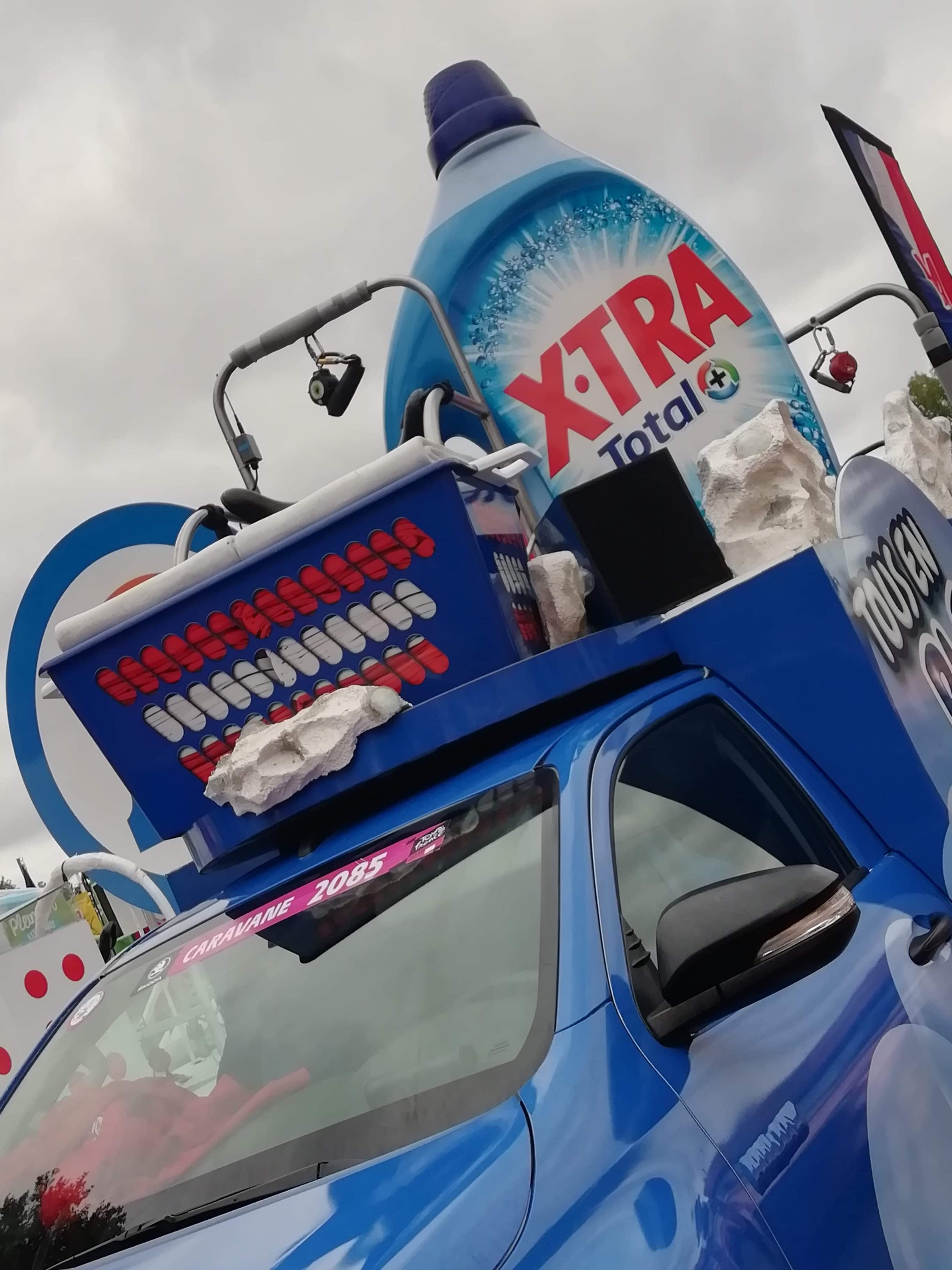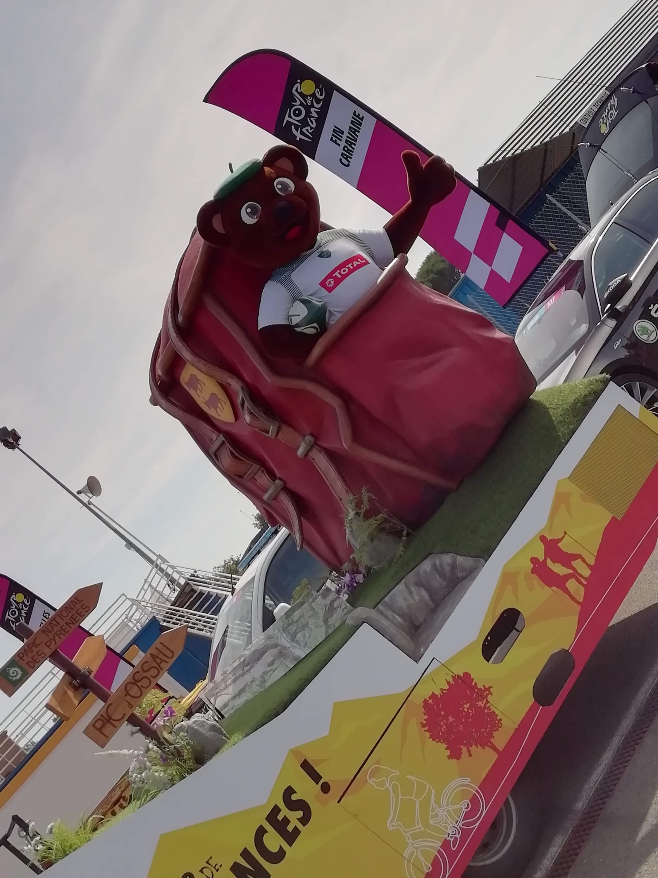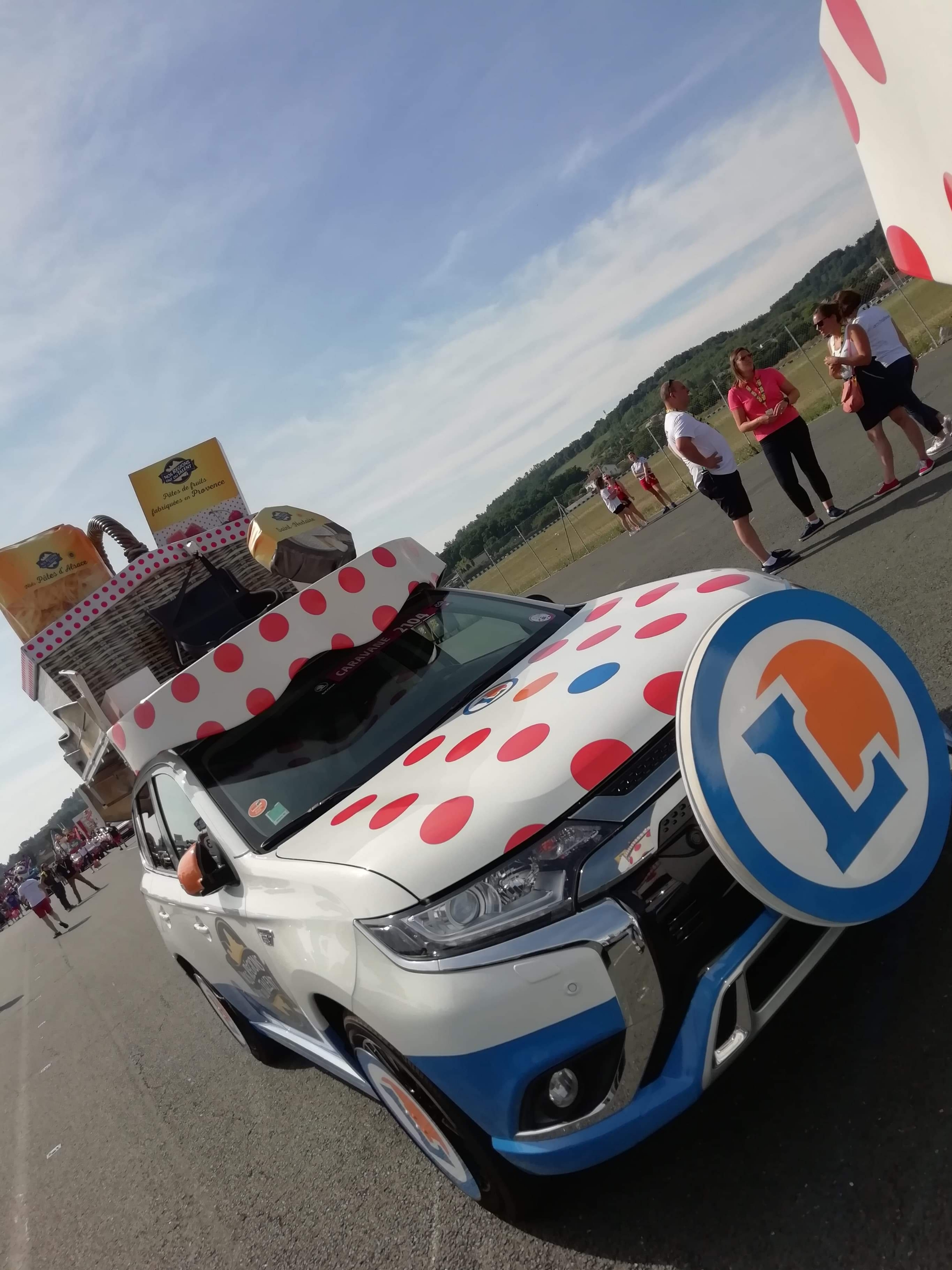 Départ 10h30 de la caravane qui s’élance avec plus de 160 véhicules au total et la marche est fermée par l’équipe Vittel qui distribue l’eau officielle du Tour de France.