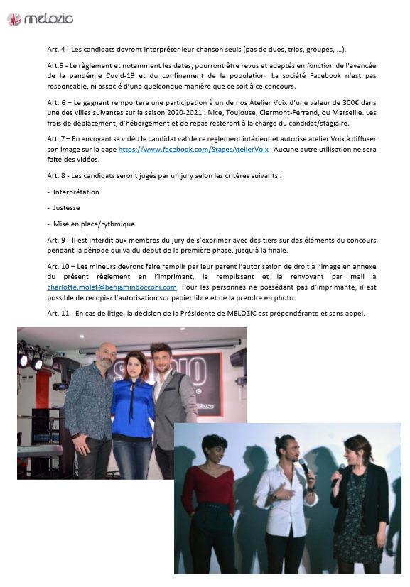 Alors n’hésitez pas à tenter votre chance pour peut-être remporter un stage de chant Atelier voix à Nice, Toulouse, Clermont-Ferrand ou Marseille (les modalités du gain sont stipulés dans le règlement du concours.
