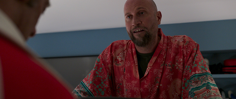 On est obligé de calculer le bras de la grue pour dire que les sièges doivent être à telle distance. Il y a une machine qui s’appelle un “gimbel” fabriqué avec des vérins hydraulique et un axe particulier. Il faut vérifier que la caméra puisse passer à travers les endroits du décor qui compose l’avion. C’est une scène difficile à concevoir, à préparer et à tourner. Côté visuel ce n’est pas évident non plus avec des plans de drone qui doivent correspondre au mouvement. Les acteurs eux ont la même vision mais pour d’autres raisons comme : “il faisait chaud, on était attaché”. Ils sont devenus un peu fou vu que ça a pris 4 jours en studio pour faire cette partie.