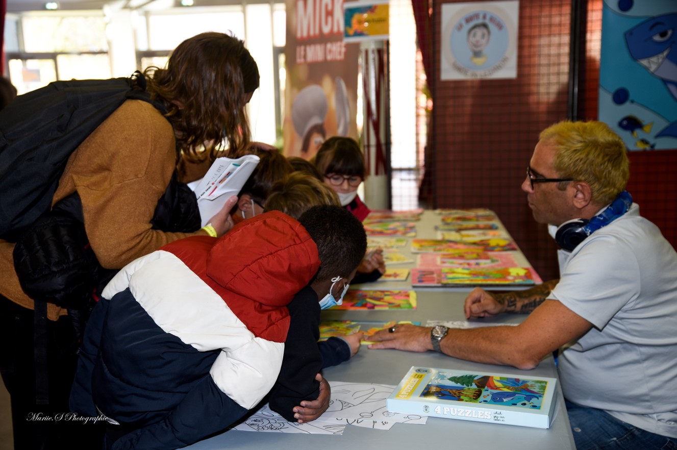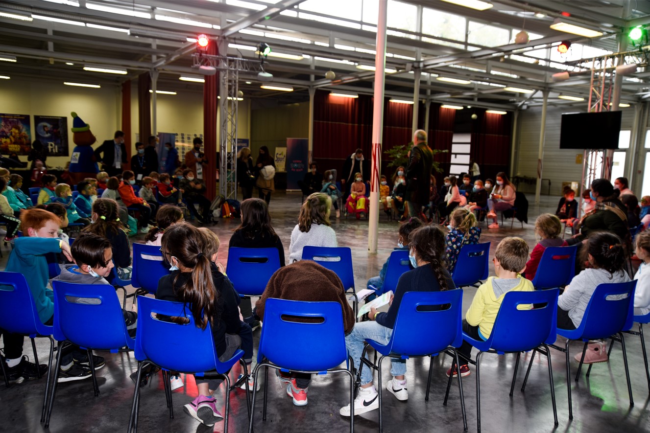 Dans l’Agora le président du Jury Marc Du Pontavice captive petits et grands en parlant de son métier de producteur. Il échange avec les enfants qui l’entourent.