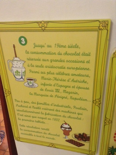 Ensuite, nous avons pu admirer d’autres sculptures plus vraies que nature, en chocolat bien entendu, avant de passer à la salle des machines ( dragéifieuse, machine à mouler en creux …) , toutes en parfait état de marche. Nous avons admiré aussi quelques publicités de notre enfance, qui témoignent d’une démocratisation progressive du chocolat, autrefois réservé à une élite. Et enfin conclu notre parcours gourmand par un résumé de l’élaboration du chocolat, du concassage jusqu’au produit fini. Que nous avons bien entendu dégusté chaud, fort en saveur, et proprement à tomber, avec les autres visiteurs. Avant de passer par la boutique et de repartir avec quelques douceurs qui ne seront bientôt plus qu’un lointain et doux souvenir.