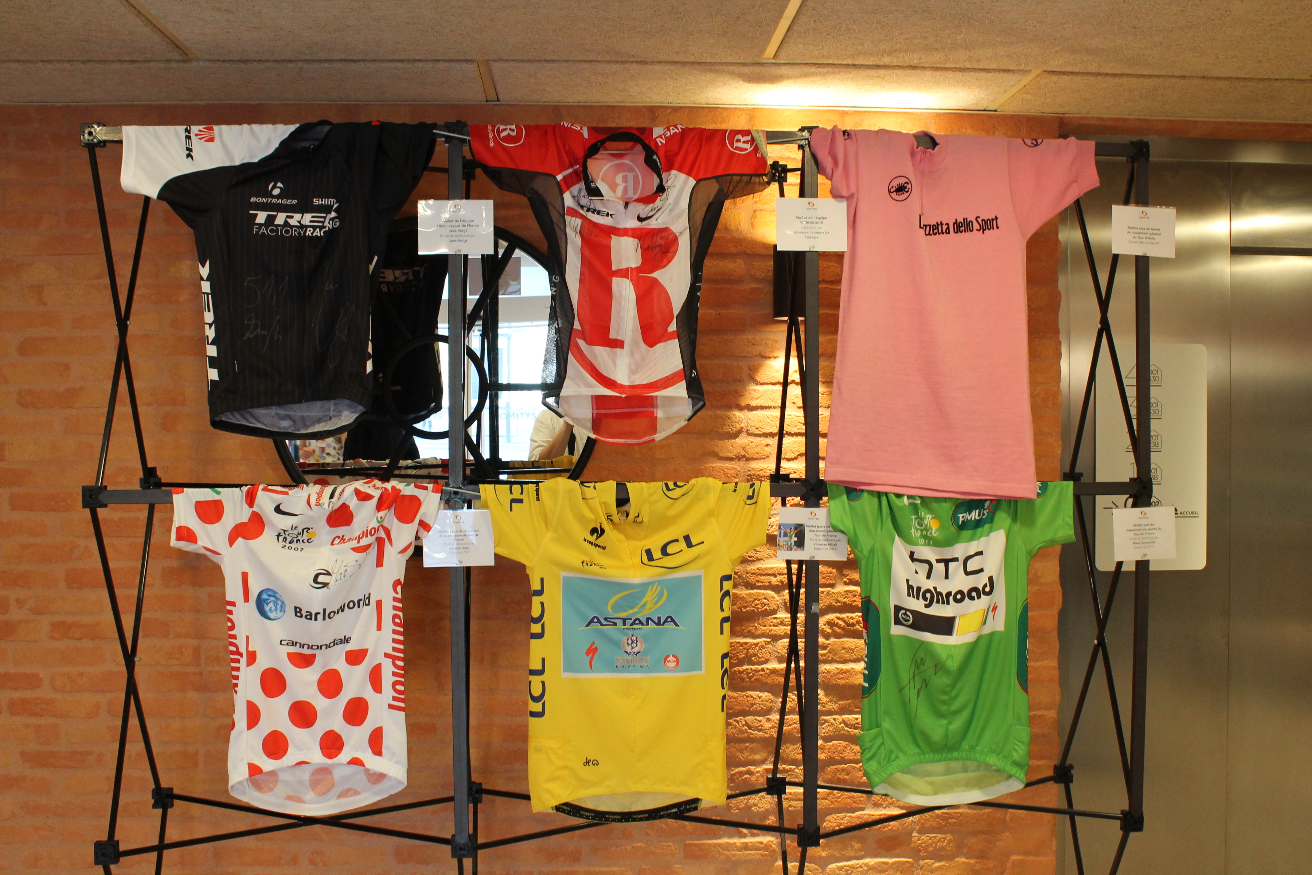 Petits et grands pourront voir ou revoir des objets iconiques du plus grand événement cycliste mondial : du maillot d’Eddy Merckx de sa grande époque chez MOLTENI, au maillot Jaune de Philippe Gilbert sur le Tour 2011, en passant par le vélo de contre-la-montre de Sandy Casar (FDJ.com) ou encore aux livres de route des années 50-60…