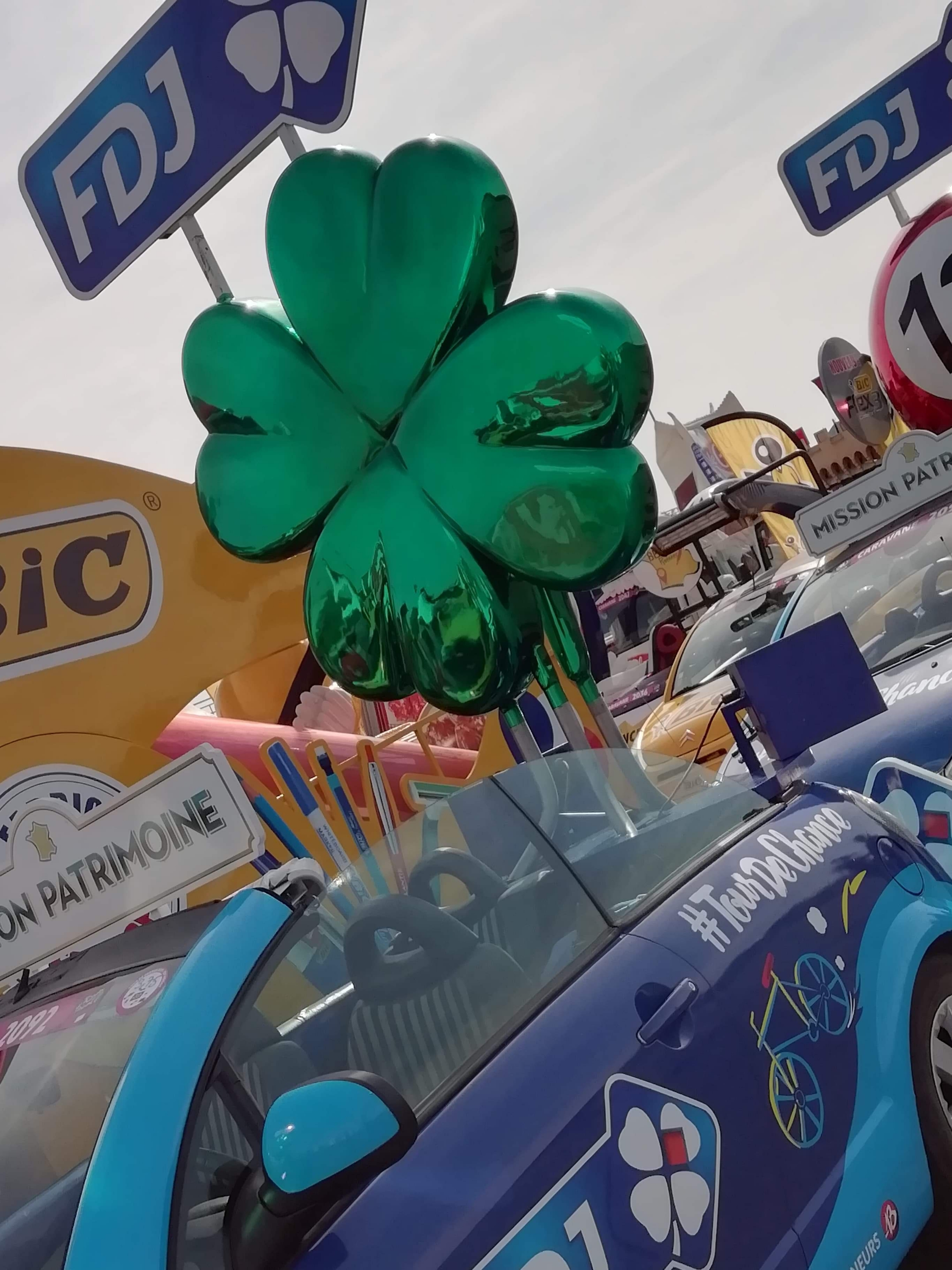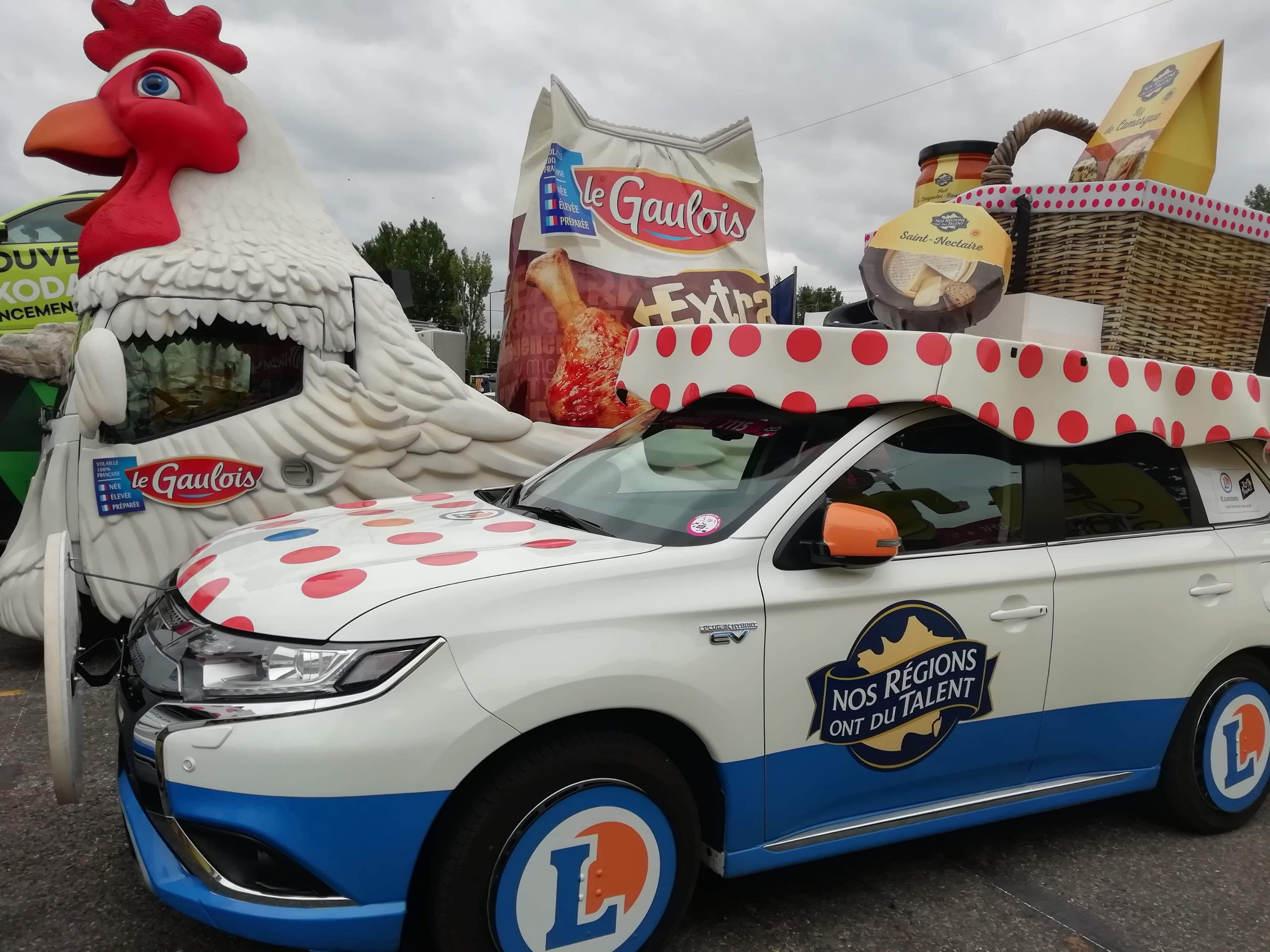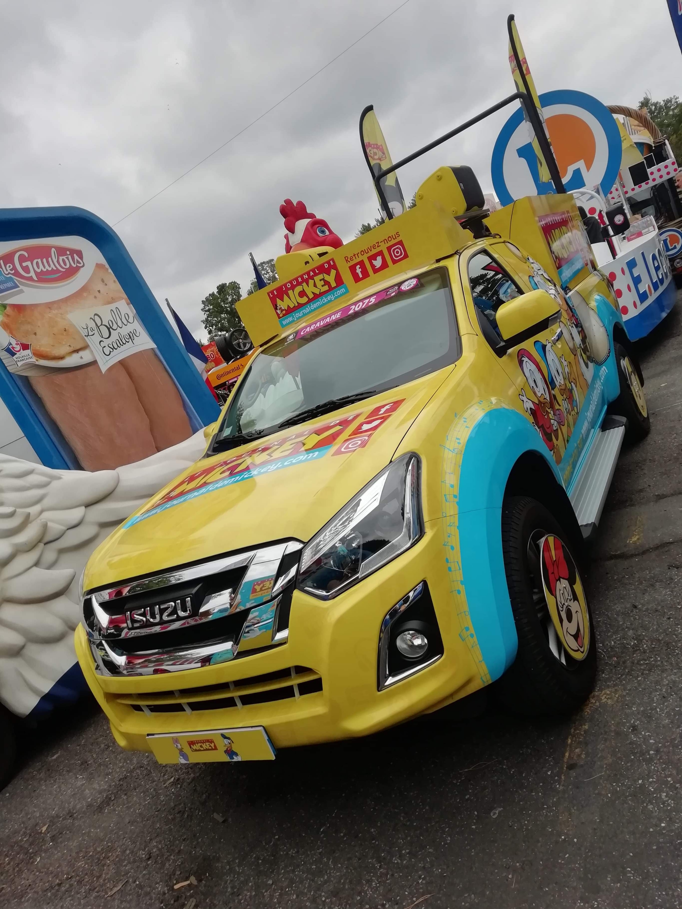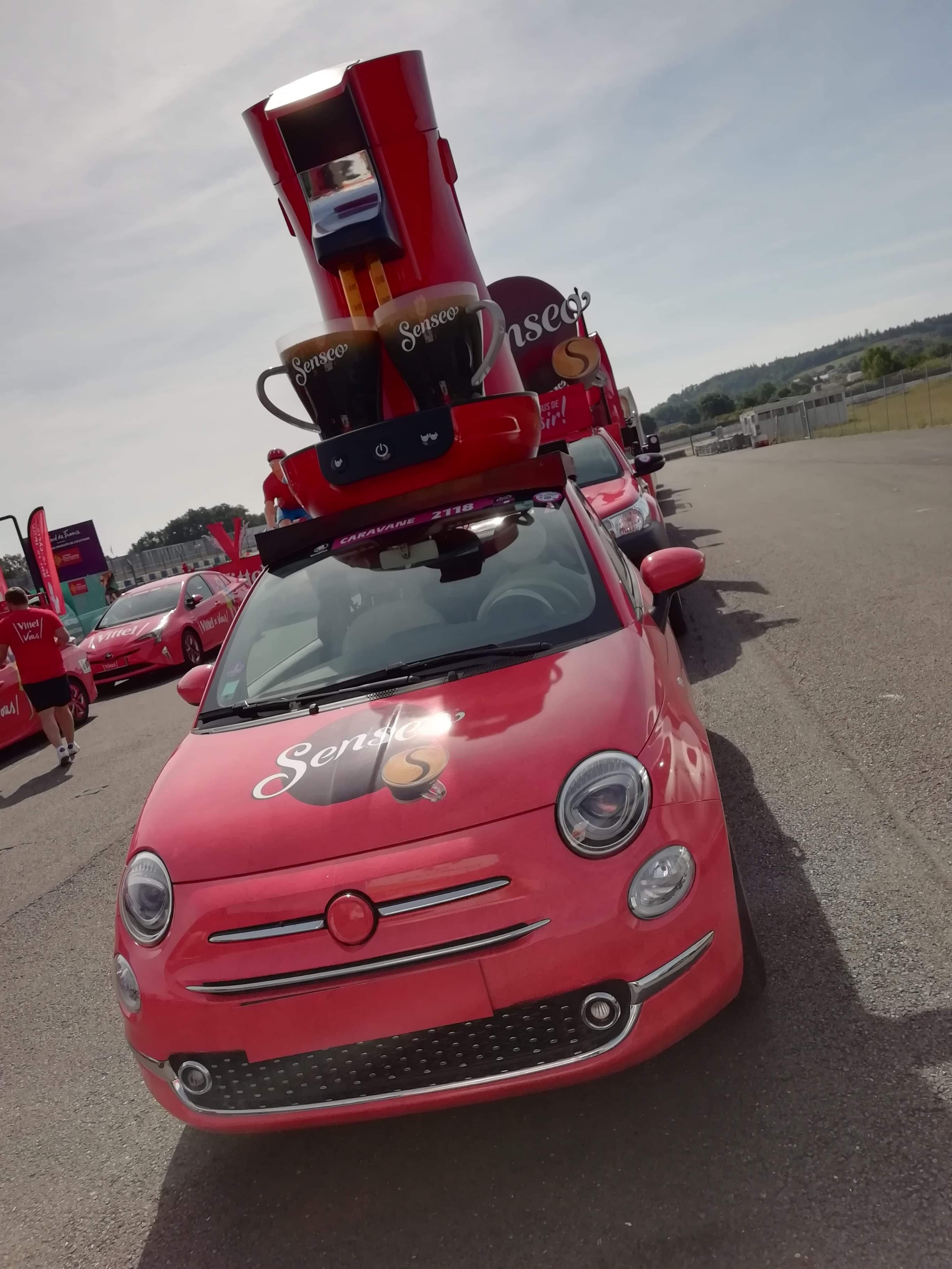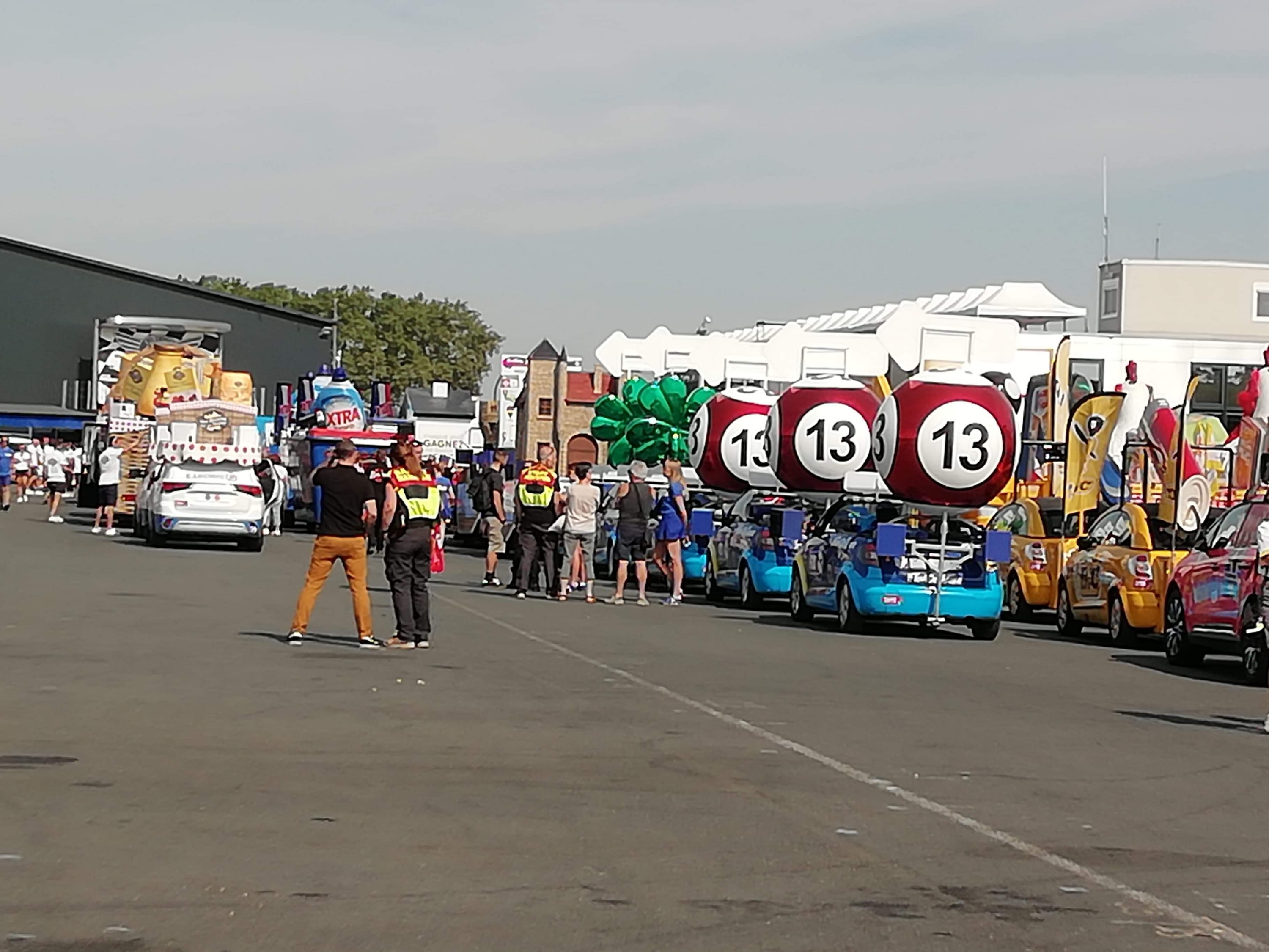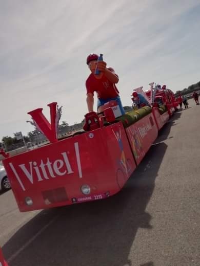 Départ 10h30 de la caravane qui s’élance avec plus de 160 véhicules au total et la marche est fermée par l’équipe Vittel qui distribue l’eau officielle du Tour de France.