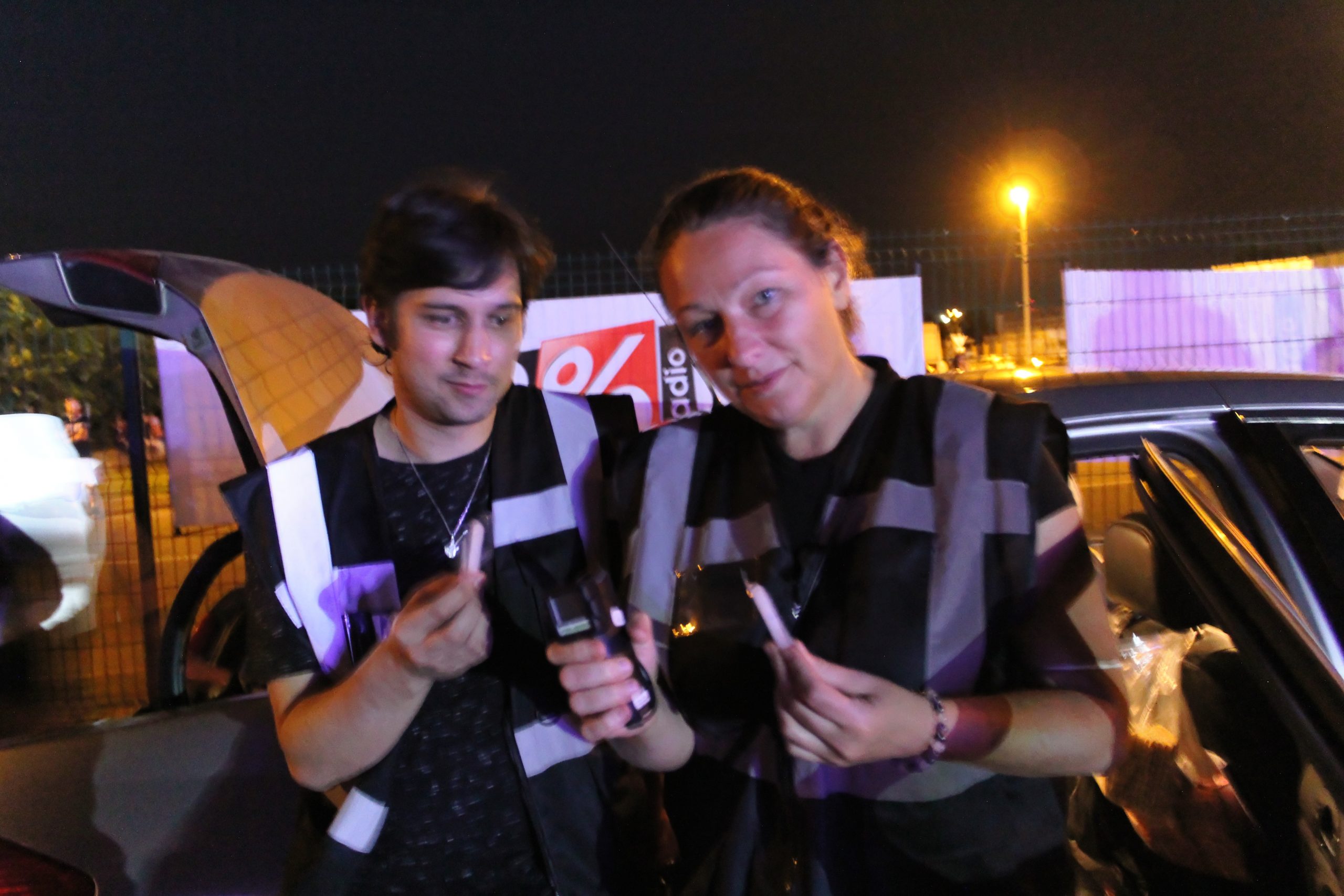 Wilfried pendant l’installation des prochains artistes part faire un tour sur le parking pour vérifier si l’autoradio des véhicules et allumé et retransmet le concert comme prévu.