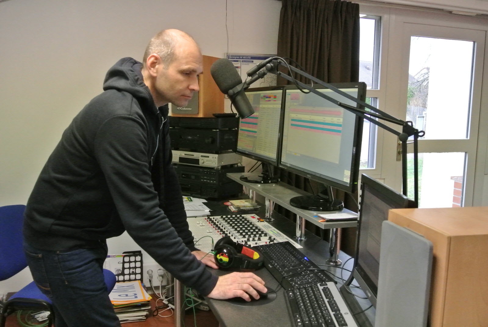 J’ai été pendant 12 ans animateur radio, rien à voir (rires). J’ai effectué un changement radical d’orientation quand je me suis rendu compte qu’animer une émission radio ne m’intéressait plus. J’ai donc fait une formation en restant dans le milieu de la radio. C’est un avantage car je sais exactement ce qui se passe je connais le process d’un animateur j’anticipe les réactions. Cela me permet de mieux comprendre même les choses les plus tordues quand il y a un truc qui ne marche pas. J’ai commencé en 2008 à la technique donc ça fait 12 ans déjà. En fait, 12 ans en animation radio et 12 ans à la technique (rires). Waouh 24 ans de travail !