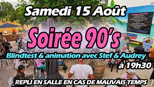 Enfilez votre veste en jean ou votre salopette avec chemise en flanelleSamedi 15 août, à 19h30, rendez-vous avec une soirée années 90. Entre Blindtest et animations plongez vous dans ces riches années.