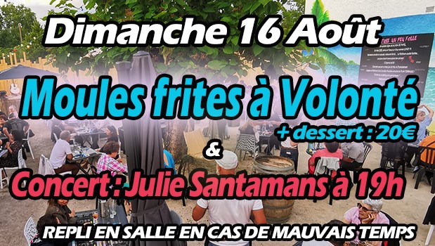 Petit tour en Belgique et au nord de la FranceDimanche 16 août, c’est une soirée moules frites à volonté. De quoi ravir les amateurs de ce plat si appétissant et très aimé, Plat et Dessert à 20 euros. Un petit goût iodé accompagné à partir de 19h d’un concert de Julie Santamans.
