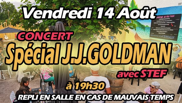 Soirée avec un grand monsieur de la chanson françaiseVendredi 14 août, à 19h30, Concert spécial Jean Jacques Goldman avec Steph. Stef vous donne rendez-vous afin de revivre tous les plus grands succès de ce Grand Monsieur de la Chanson Française.