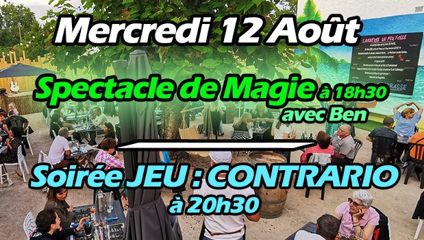 Entre Magie et CompétitionAujourd’hui, à 18h30 place à la magie pour les apprentis petits magiciens avec Ben. Et à 20h30, Soirée jeu contrario qui est dit ludique et festif, mais qu’est-ce que c’est ? Pour le savoir nous avions pris contact avec Mathieu de l’équipe lors de la première édition du contrario à la terrasse. Il nous avait dit : “A la base le contrario c’est un jeu de société avec des énigmes. Par exemple pour faire deviner le titre d’une chanson je dis, éteindre l’eau… Le contraire c’est donc Allumer le feu. Ou encore un dessin animé, la grande baleine ça donne la petite sirène. On a mis au point une soirée autour de ce concept de jeu. Il va y avoir des défis entre les différentes tables avec les personnes présente et on verra qui remportera le challenge”.