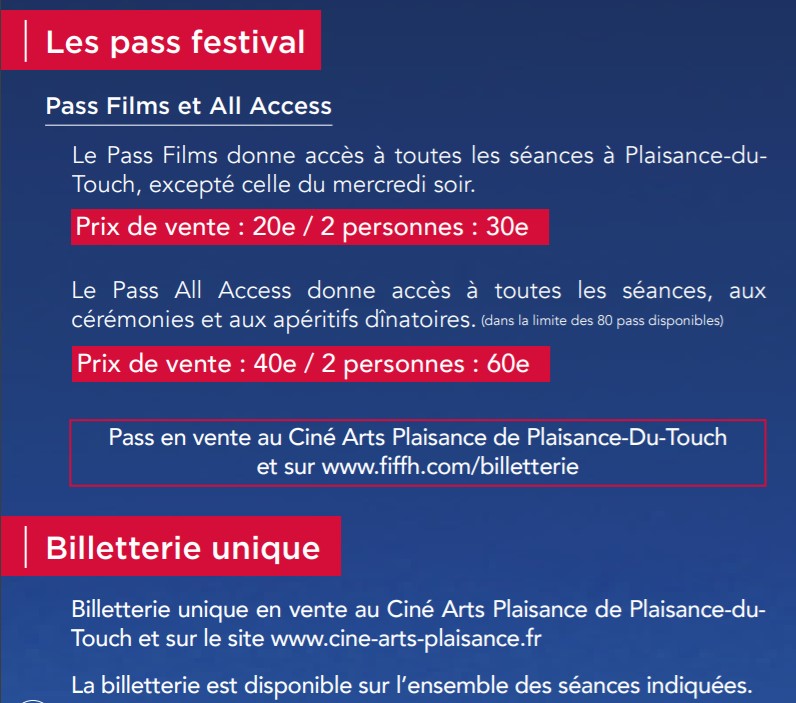 Pour réservez votre billets ou votre pass pour suivre l’intégralité du FIFFH, rendez-vous sur la billetterie. Sinon vous pouvez vous rendre à l’accueil du cinéma de Plaisance du Touch.
