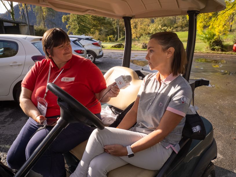 Avant de rejoindre le parcours du golf de Lourdes, Delphine nous a accordé un petit moment pour répondre à nos interrogations. Et comme la petite voiturette de golf était confortable nous y avons pris place.