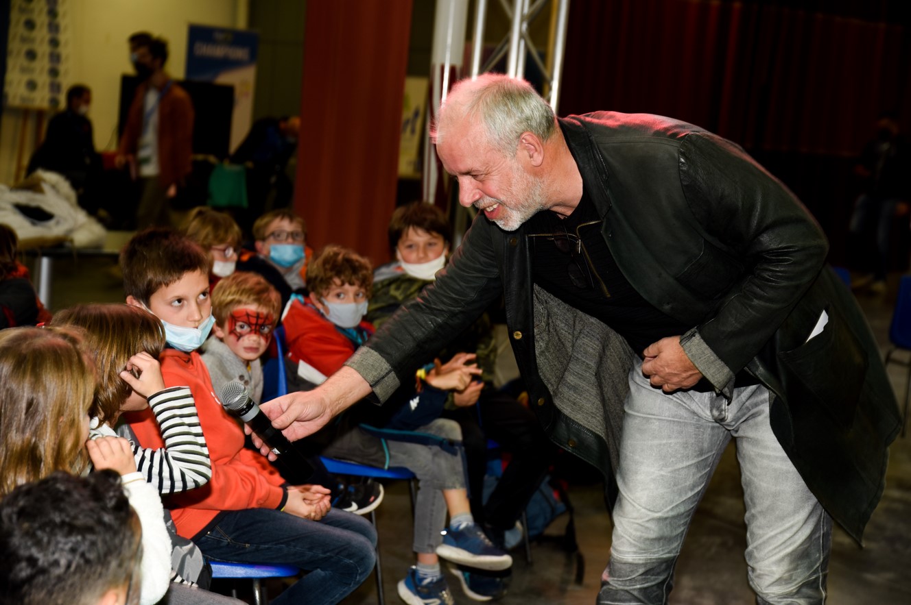 Dans l’Agora le président du Jury Marc Du Pontavice captive petits et grands en parlant de son métier de producteur. Il échange avec les enfants qui l’entourent.