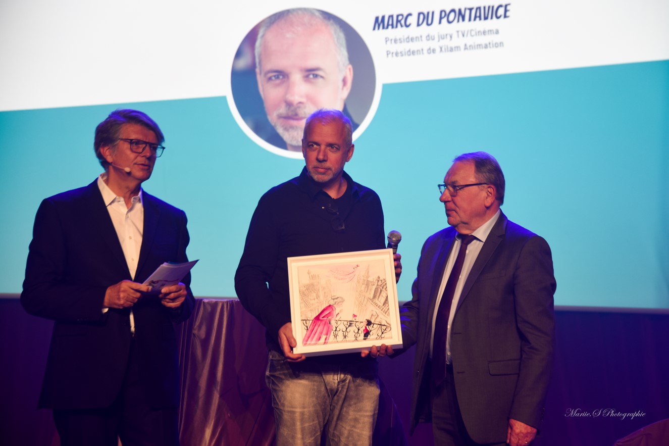 Monsieur Marc Du Pontavice a reçu un prix d’honneur des mains de Claude Cazabat, Maire de Bagnères-de-Bigorre pour son travail de producteur et président de Xilam Animation.