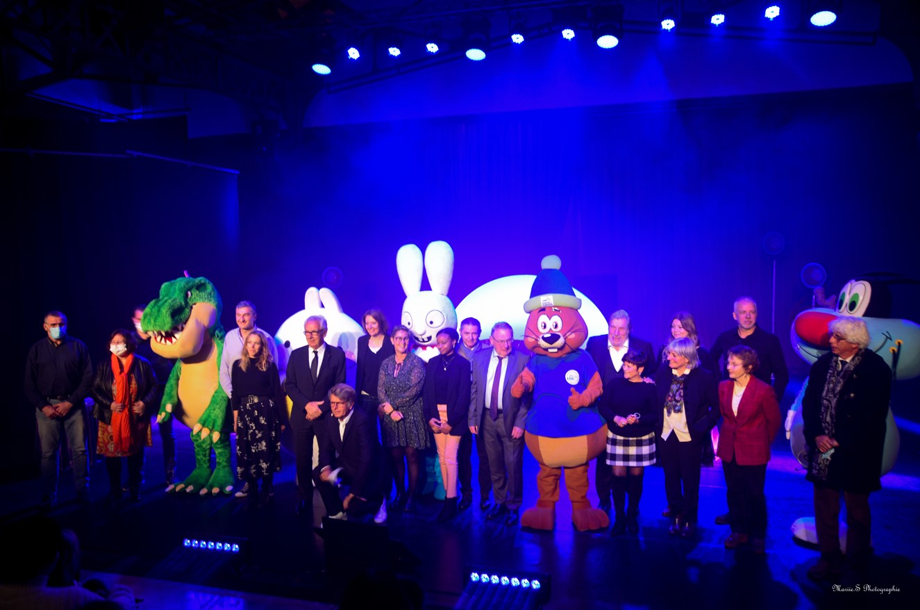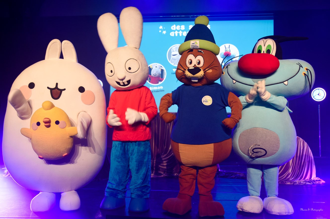 J’ai beaucoup aimé le moment où les mascottes sont arrivées sur scène même si ce ne devait pas être évident de se diriger surtout Molang et Giganto. Je ne voulais pas que le présentateur fasse aux mascottes un croche patte. C’est original une photo des officiels et des membres du jury avec les mascottes.