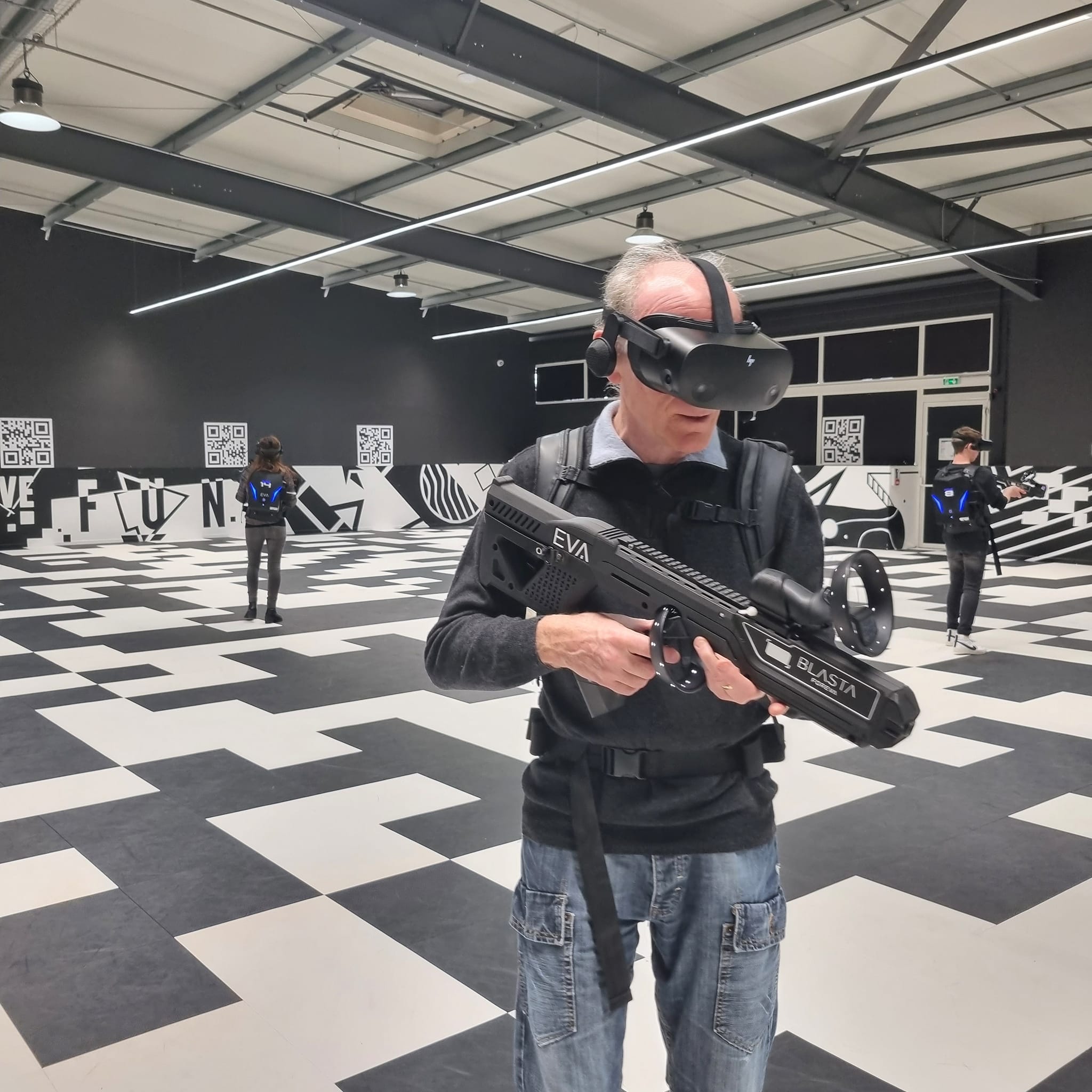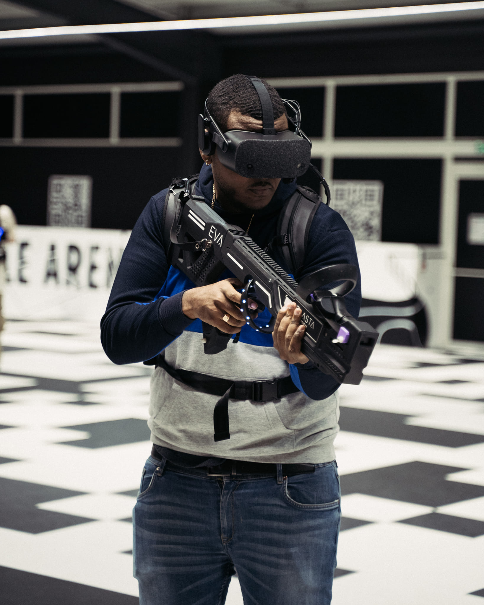 Munis d’un casque VR, d’un ordinateur en sac à dos et d’un fusil connecté, vous vous déplacez librement sur une arène pouvant aller jusqu’à 1000m2 ! C’est ce qu’on appelle le FREE ROAMING en réalité virtuelle.