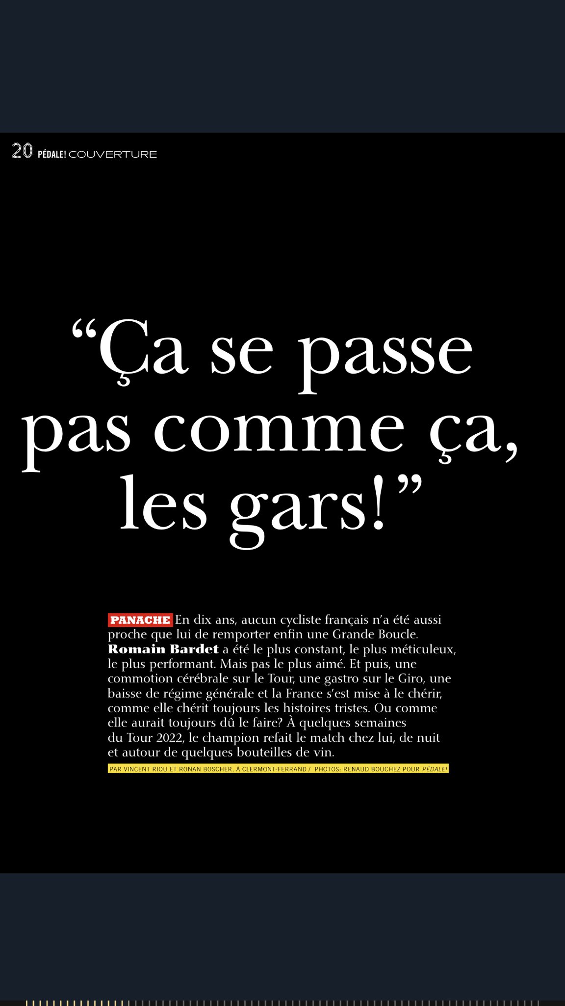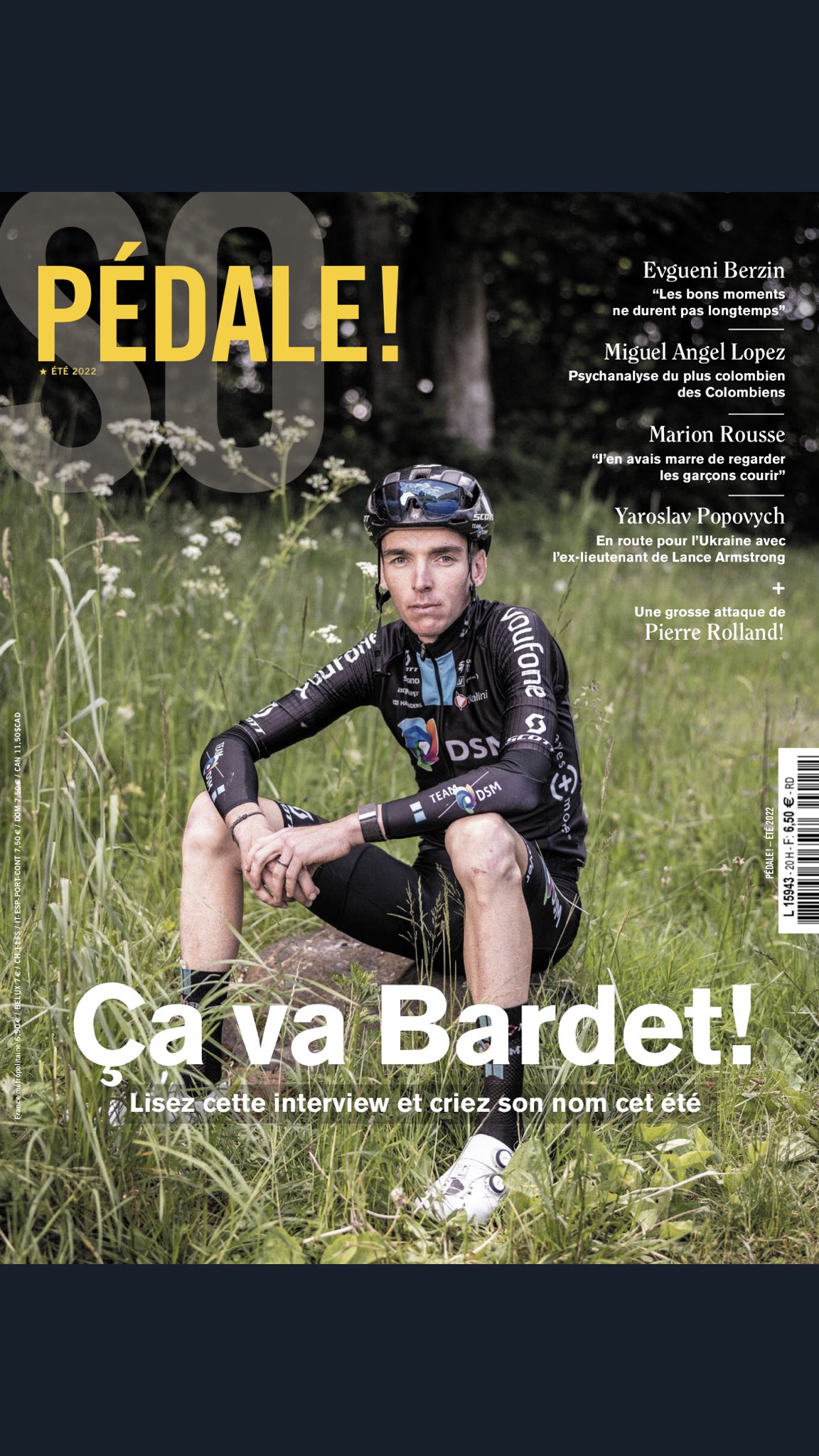 Avec pas mal d’interview au long cours dans cet opus : de Bardet ( qui fait la couv’) dont on sent qu’il est désormais libéré de la pression qu’on a bien voulu lui coller de potentiel d’un grand Tour. Un Bardet tout en détente, qui confesse son amour du bon vin, et se prendrait presque à avoir des discours de “vieux con” sur les cadences infernales imposées aux coureurs pros.