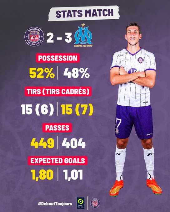 A peine le temps de s’installer pour les retardataires que cet incroyable Tef prenait l’OM à la gorge via un centre précis de Desler, lancé en profondeur par Dejaegere, qui trouvait l’inévitable Dallinga qui n’en demandait pas tant pour signer sa 9 ème réalisation de près. Le Stadium pouvait déjà s’embraser . C’est peu de dire que le Tef était entré dans son match : dans les duels, les intentions, les compensations. L’euphorie passée, le Téfécé dut s’en remettre par deux fois consécutives à un Max Dupé prime pour ne pas flancher. C’est même Pau Lopez qui miraculeusement empêchait Rouault de venir concrétiser son dépassement de fonction ( 18 ème) . Le rythme était soutenu, on pouvait s’en douter mais notre Tef ne souffrait pas de la comparaison et s’offrait des contres dévastateurs, comme celui conclu par Ratao dans les bras de Lopez à la 31ème. Cet OM là jouait haut et les attaques rapides toulousaines faisaient mal à l’arrière garde phocéenne. Aboukhlal, Ratao tour à tour faisaient chanceler Mbemba et autre Balerdi. C’est donc sur ce court avantage que les deux équipes regagnaient le vestiaire au terme d’une mi temps enlevée et très agréable. C’était désormais une certitude : le Tef était plus qu’ invité à la fête .