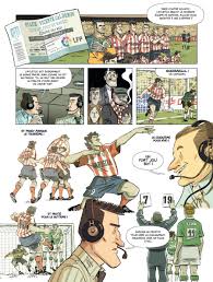 C’est l’angle choisi par la BD ” Un dernier tour de terrain” aux éditions Aventuriers d’Ailleurs. L’histoire en deux actes, ou deux mi temps, de Beni, agent prêt à tout les sacrifices, capable de s’envoyer des déplacements dans l’Espagne profonde pour dégoter notamment le dénommé Fali et en faire une star de la Liga, ayant les honneurs du Marca. Cela fleure bon l’Espagne, ses tapas, ses “cervezas” (bières en espagnol), ses bordels aussi, et pour filer le cliché, la corrida… Qui mettra fin au premier acte de la BD en même temps qu’à la success storie conjointe promise à Beni et Fali.