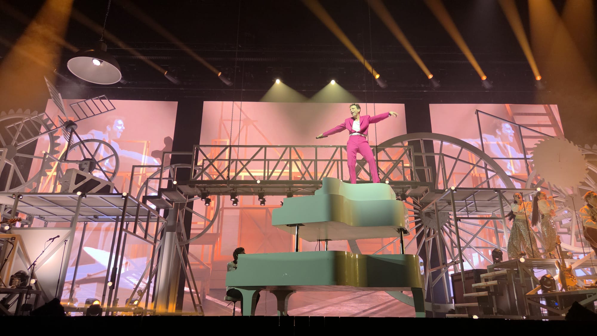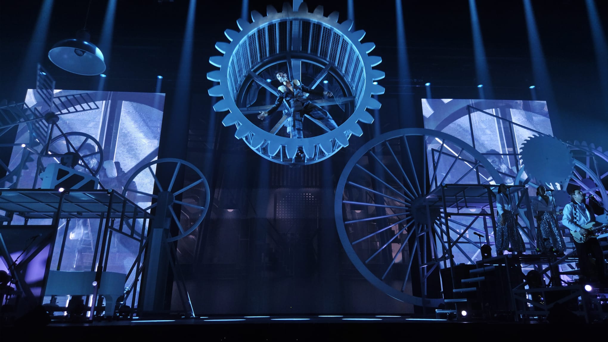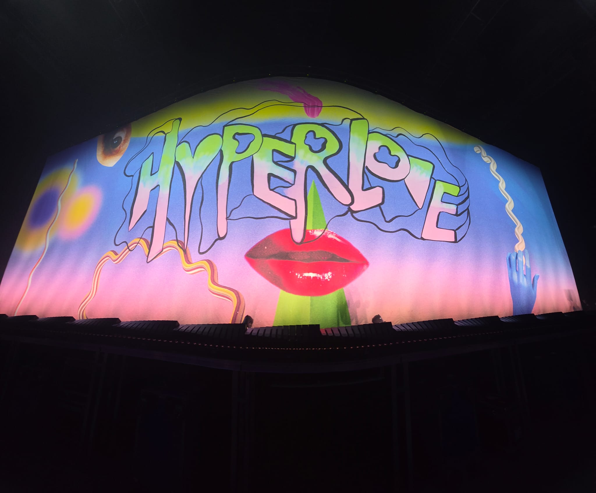 HYPERLOVE. L’amour en grand proclamé sur un rideau coloré, qui occupe l’entièreté de la scène. Un œil observe le public toulousain qui attend Mika en s’échauffant sur la playlist pré-concert. Puis, sans prévenir la lumière s’éteint, le rideau tombe pour laisser place à un décor au style industriel, composé d’engrenages et de roues métalliques. Une roue en particulier attire notre attention, perchée à plusieurs mètres de hauteur. Elle commence à tourner, entrainée par un homme, qui court de plus en plus vite, après le temps…